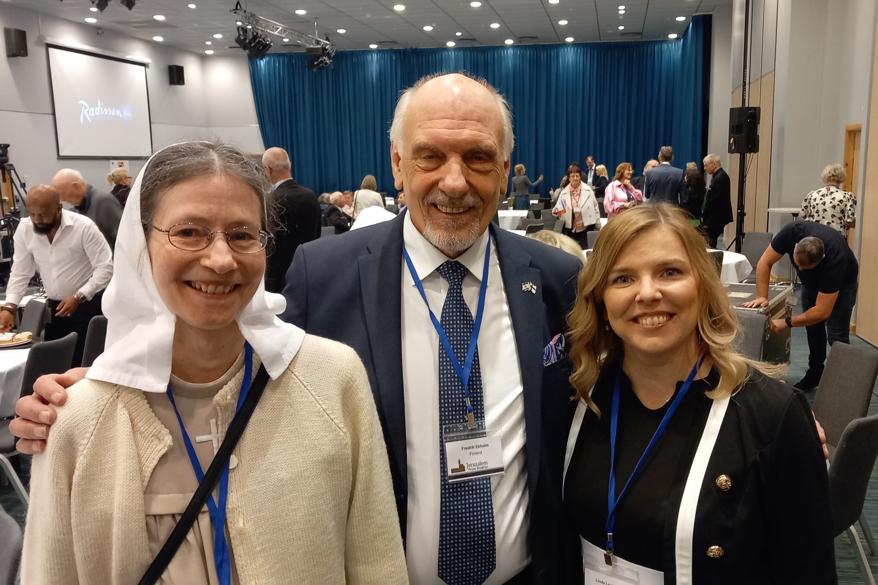 I våras blev syster Mirofora och syster Angelina inbjudna till den så kallade ”Jerusalem Prayer Breakfast”. Under de senaste dagarna och månaderna har vi sett hur viktigt det är att vi vågar stå på Israels sida. Nyligen hörde vi hur vår norska statsminister använde Kristallnatten (9 november *) för att tala på följande sätt: ”Att krossa glas kan i vår tid ske på nätet, på sociala medier, i kommentarfält, ja – även under markeringar och arrangemang. Ofta mot minoriteter – judar, muslimer, samer, romer, hbtq-personer och andra.” Bland norska judar, ja, helt upp till det israeliska utrikesdepartementet, utlöste det en stor sorg att han inte tog emot inbjudan till synagogan, utan valde ett helt annat sätt att markera denna dag, som 1938 banade väg för Förintelsen. Vår norska syster Lumena (som bor i Tyskland) har kontakt med ett judiskt par i Norge. När de svarade på hennes hälsning till Rosh Hashana berättade de att de ska flytta till Schweiz eftersom de inte längre känner sig trygga i Norge. Trots att de är 80 år gamla lämnar de landet.