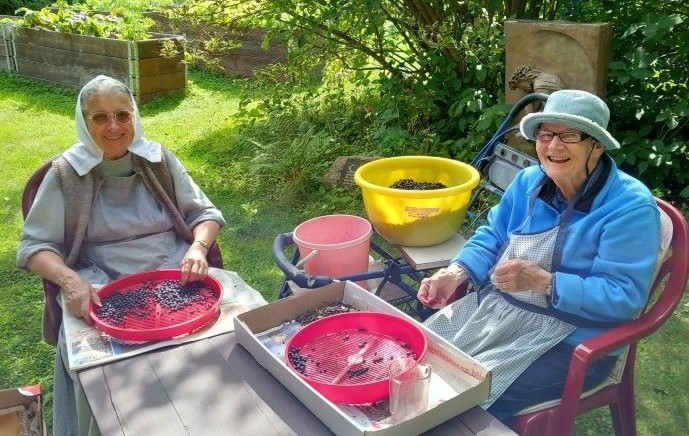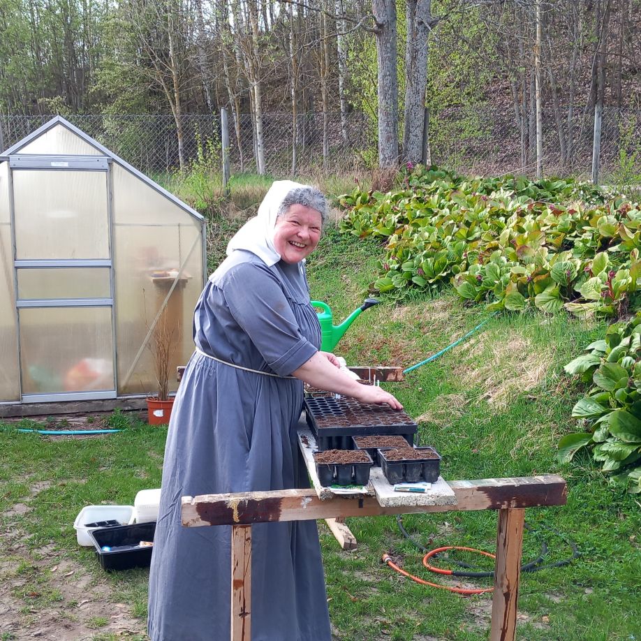 Eftersom arbetskraften var reducerad hjälpte alla till med de olika uppgifterna i trädgården. Syster Remida var särskilt engagerad. Annars arbetar hon mest inomhus med matlagning, hushållsarbete och mycket annat. Det gjorde henne gott att vara ute mer. Och även om vi inte kunde så och plantera lika mycket som vanligt, fick vi ändå skörda både det ena och det andra, också hos en vän som är bonde.